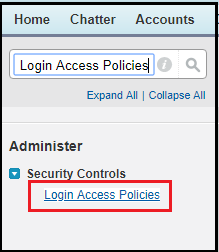 1. From Setup >> Enter Login Access Policies in the Quick Find box.